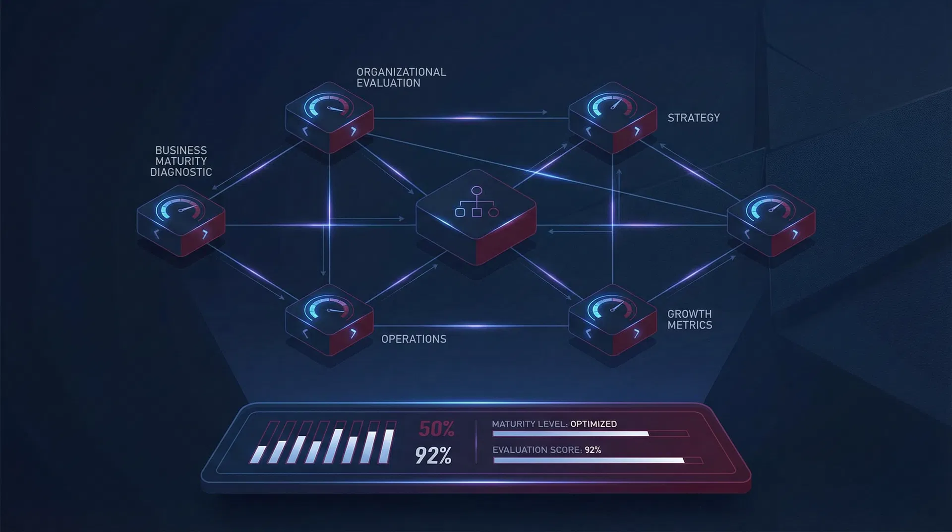 O Diagnóstico de Maturidade de Gestão é uma ferramenta estruturada que avalia o nível de organização, governança e eficiência operacional da sua empresa em quatro dimensões fundamentais.